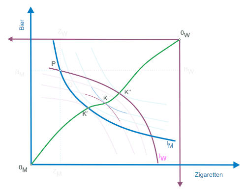 Verbindet man nicht nur die Tangentialpunkte innerhalb der Ausgangslinse, sondern alle Tangentialpunkte in der Edgeworth-Box, erhält man die sogenannte Kontraktkurve. Synonyme für diesen Begriff sind Konflikt-, Effizienz- und Pareto-Kurve. Während die beiden ersten Bezeichnungen Ihnen an dieser Stelle von der Wortwahl her noch unklar sein dürften, so sollten die beiden letzten klar sein.
