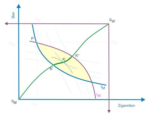 Jetzt kennen Sie die Edgeworth-Box und ihre Bestandteile. Sie haben sie hier jedoch anhand einer eher unüblichen Vorgehensweise kennengelernt. Üblicherweise orientieren sich Lehrbuchdarstellungen der Edgeworth-Box am Beispiel des freiwilligen Tausches zwischen zwei Individuen, wohingegen hier ein übergeordnete Instanz durch dirigistische Umverteilungsanordnungen eine pareto-optimale gleichgewichtige Situation K herbeigeführt hat. Das Übliche lässt sich nun mit wenigen Worten nachholen. Festzuhalten ist, dass die Edgeworth-Box mit freiem Tausch und Marktwirtschaft nicht mehr und nicht weniger zu tun hat als mit angeordnetem Tausch und Planwirtschaft.