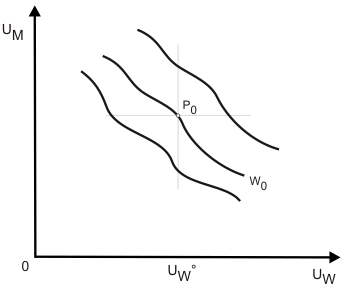 P0 verkörpert für den Konsumenten und die Konsumentin bestimmte Nutzenniveaus $U_M^0$ und $U_W^0$. Durch Einsetzen dieser beiden Werte in die Wohlfahrtsfunktion (1) erhalten wir ein gesellschaftliches Wohlfahrtsniveau, das als $W_0$ gekennzeichnet sei. Eine Bergson-Indifferenzkurve hat die Eigenschaft, dass alle Punkte auf ihr eben dieses Wohlfahrtsniveau $W_0$ anzeigen. Da das Wohlfahrtsniveau mit den individuellen Nutzen von Konsument und Konsumentin steigt, können die Punkte $P_1$, $P_2$ und $P_3$ nicht auf dieser Bergson-Indifferenzkurve liegen, sondern würden jeweils ein höheres Nutzenniveau anzeigen als $P_0$. Dabei kann a priori nicht ausgeschlossen werden, dass $P_1$ und $P_2$ auf derselben Bergson-Indifferenzkurve liegen. Ebenso können wir schließen, dass $P_4$, $P_5$ und $P_6$ nicht Punkte der Bergson-Indifferenzkurve durch $P_0$ sein können. Damit bleibt für den Verlauf der Kurve nur der (streng) nordwestliche und südöstliche Bereich von $P_1$.