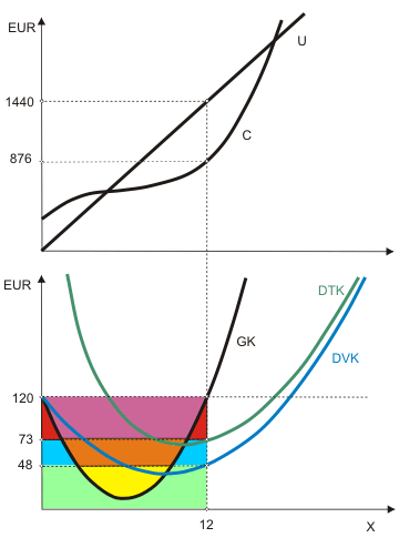 Die gewinnmaximierende Produktionsmenge (siehe Preis-Grenzkosten-Regel) liegt für ein Konkurrenzunternehmen, das für das Produkt einen Preis von 120 Euro je Einheit erlösen kann, bei $x = 12$.