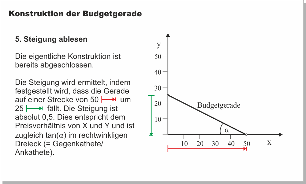 Die (absolute) Steigung der Budgetgerade entspricht dem Preisverhältnis der beiden Güter. Jeder Punkt auf der Budgetgerade zeigt ein Güterbündel, das sich der Haushalt von seinem Einkommen kaufen kann. Da unterstellt wird, dass der Haushalt sein Einkommen vollständig ausgibt, muss er sich auf der Budgetgerade befinden.