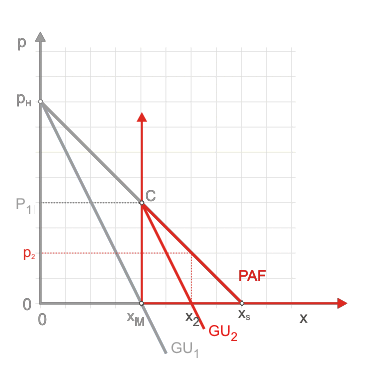 Man überlegt leicht, dass die Lösung für die beiden Duopolisten bei unverändertem Verhalten zwar stabil, aber nicht optimal ist. Der maximale Umsatz, den der Markt hergibt, ist der Monopolumsatz. Jede andere Menge – wie sie zwischen beiden Anbietern auch immer aufgeteilt sein mag – bringt einen geringeren Umsatz. Die beiden Duopolisten könnten sich also verbessern, wenn sie ihre Produktionsmenge einvernehmlich von $2/3$ auf $1/2$ reduzieren, m.a.W. wenn sie ein Kartell bilden.