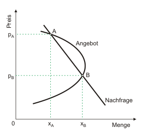 In beiden Schnittpunkten A und B stimmen zu den jeweiligen Preisen die geplanten Angebots- und Nachfragemengen überein. Ohne weiteres kann es bei einem weiteren Bogen der Angebotsfunktion auch zu drei Marktgleichgewichten kommen.