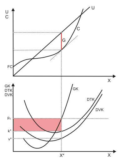 $$ G(x) = p_xx - C(x) \tag{3} $$und anschließend die erste Ableitung gleich null gesetzt